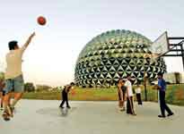 Các học viên chơi bóng rổ vào buổi chiều trước tòa nhà Multiplex Dome mới xây dựng | Với những chiếc dù mang logo Infosys, các học viên bước ra khỏi toà nhà Trung tâm Giáo dục toàn cầu (Global Education Center) để chuẩn bị ăn trưa |