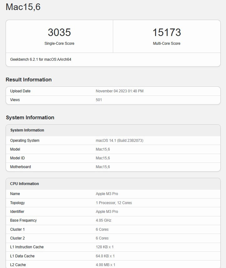 Dữ liệu đăng tải trên Geekbench tiết lộ thông số kỹ thuật của SoC, với 6 lõi hiệu suất cao và sáu lõi tiết kiệm điện năng. Trong đó, tất cả các lõi hiệu suất cao đều chạy ở tốc độ 4,05GHz. Đây là giá trị tốc độ xung nhịp nhất quán trên tất cả các mẫu chipset M3 của Apple, dẫn đến kết quả lõi đơn tăng lên, điều mà M3 Pro đạt được so với biến thể CPU 12 lõi của M2 Pro với tỷ lệ cải thiện là 14%. Thật không may, trong kết quả đánh giá hiệu năng đa lõi, hai con chip này chỉ có mức chênh lệch hiệu suất 6%, với M3 Pro đạt được số điểm 15.173, trong khi M2 Pro đạt trung bình 14.229 điểm.