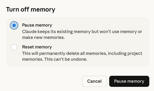 Người dùng có thể tạm dừng tính năng ghi nhớ bằng lựa chọn Pause memory, cho phép chatbot giữ lại dữ liệu cũ nhưng không tạo thêm dữ liệu mới.