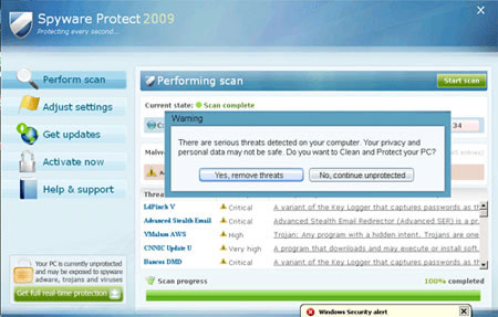 Conficker tải một chương trình có tên Spyware Protect 2009 và hiển thị cảnh báo rằng máy tính của người dùng đã bị nhiễm phần mềm gián điệp và cần thanh toán 49,95 USD để xóa file.