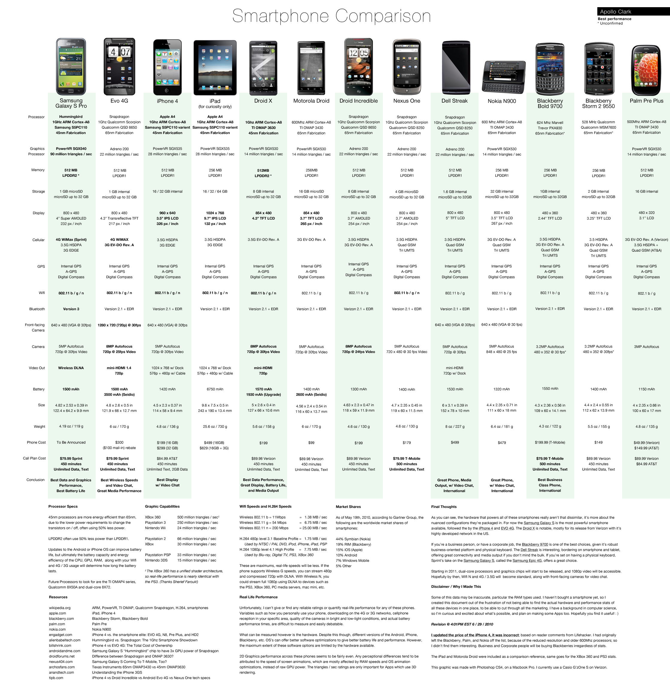 Apollo Clark, một độc giả tại Life Hacker đã tập hợp những thông tin thành một bảng dễ hiểu về những chiếc điện thoại đang có mặt trên thị trường Mĩ như những thiết bị iPad và Dell Streak..