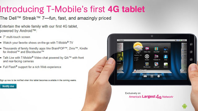 Theo nguồn tin từ TmoNews và Engadget, Dell Streak 7 nhiều khả năng sẽ được ra mắt chính thức vào ngày 2/2 tới trước tiên thông qua hợp đồng với nhà mạng T-Mobile của Mỹ. Nếu tin đồn là chính xác, Streak 7 sẽ là tablet có kết nối 4G đầu tiên của mạng viễn thông này.