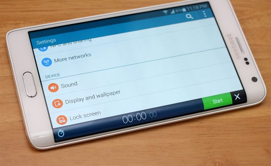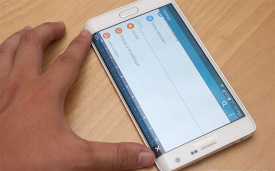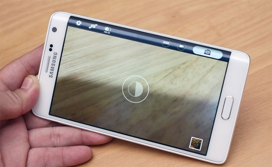 Khi vuốt trái, phải từ phần màn hình cong của Galaxy Note Edge, người dùng có thể lựa chọn các ứng dụng yêu thích và kích hoạt ngay từ đây mà không cần trở về màn hình chủ. Trong hình dưới, người viết có thể thao tác chụp ảnh nhanh trong khi vẫn đang ở trong phần cài đặt của máy.