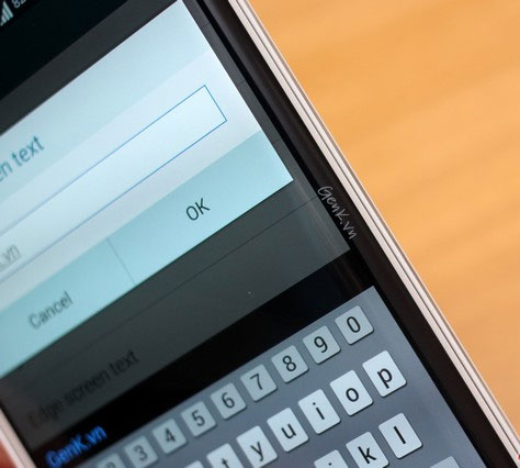Khi không có thông báo, phần màn hình cong của Galaxy Note Edge sẽ luôn hiển thị một dòng chữ, và người dùng có thể tùy biến phần này một cách dễ dàng. Phần này khi chưa kích hoạt sẽ có kích thước nhỏ hơn, nhưng vẫn có thể hiển thị một dòng chữ ví dụ như tên người chủ sở hữu hay ở đây chúng tôi thiết lập là GenK.vn.