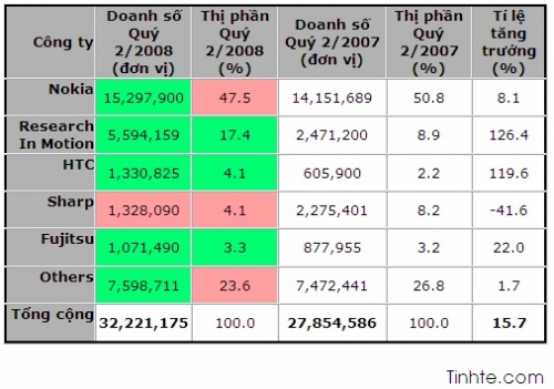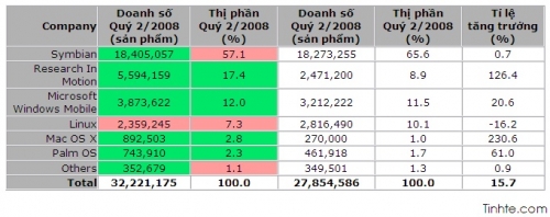 Tổng số lượng điện thoại thông minh được bán ra trong quý II/2008 ước đạt con số 32,2 triệu đơn vị sản phẩm. Con số này đã thể hiện sự tăng trưởng 15,7% khi so sánh với quý II/2007.