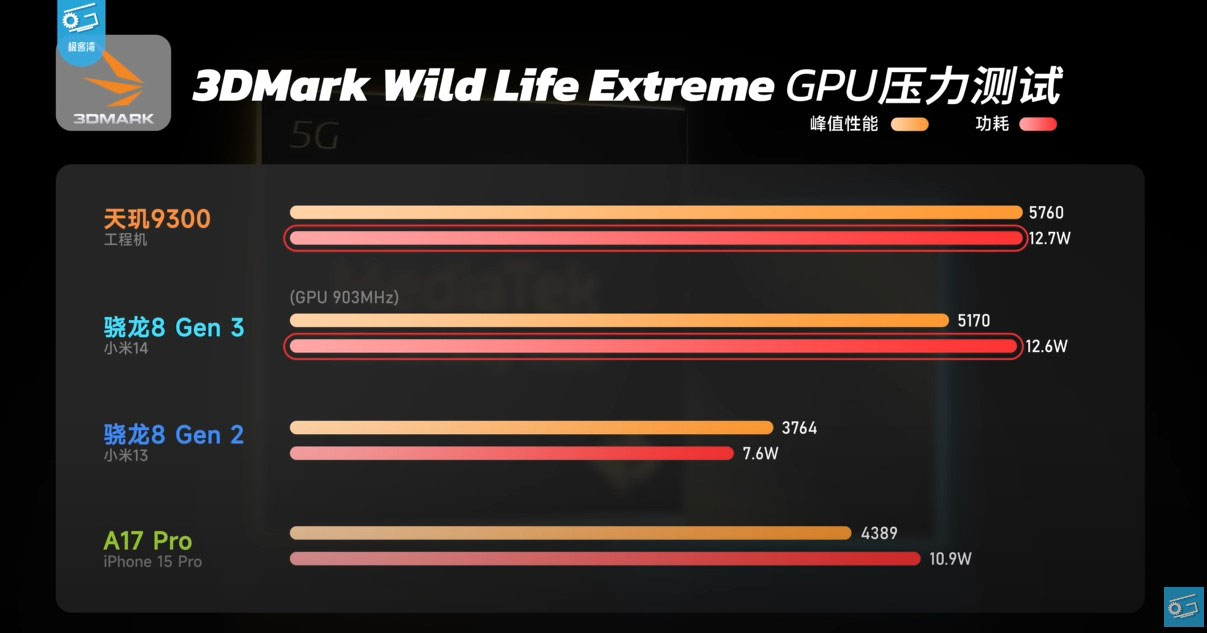 Dimensity 9300 hoạt động với mức tiêu thụ điện năng cao hơn 19,8% so với A17 Pro, nhưng lại cho hiệu năng GPU vượt trội trong 3DMark Wild Life Extreme