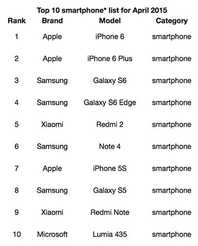 Hai chiếc smartphone màn hình lớn của Apple tiếp tục duy trì được doanh số tốt và khẳng định vị thế của mình. Trong khi một báo gần đây tiết lộ "Sự xuất hiện của chiếc Galaxy S6 và S6 Edge đang khiến doanh số của những thiết bị Android cao cấp khác gặp khó khăn,". Cũng trong bảng xếp hạng trên, hai model ở vị trí thứ 5 và thứ 6 lần lượt là chiếc Xiaomi Redmi 2 và chiếc phablet của Samsung, Galaxy Note 4. Trong khi chiếc smartphone giá rẻ của Microsoft là Lumia 435 đứng ở vị trí thứ 10.