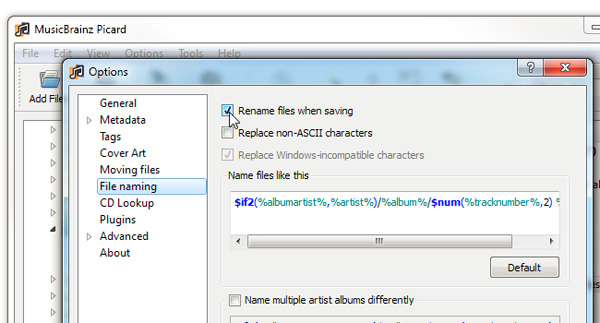 Giờ đây, khi chúng ta đã có được thông tin metada cần thiết, hãy lưu những thông số này trực tiếp và từng file. Nhưng trước đó, hãy để Picard đổi tên file tự động dựa vào metadata này, ở chế độ mặc định này thì tính năng này đã bị vô hiệu hóa. Chọn menu Options > File naming và đánh dấu vào ô Rename files when saving: