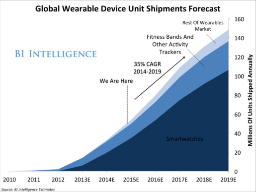 Thị trường thiết bị điện tử có thể gắn trên người là một trong những thị trường tăng trưởng lớn nhất trong ngành công nghệ. BI Intelligence ước tính rằng sẽ có 148 triệu thiết bị đeo như smartwatch và thiết bị theo dõi thể thao sẽ xuất xưởng vào năm 2019.