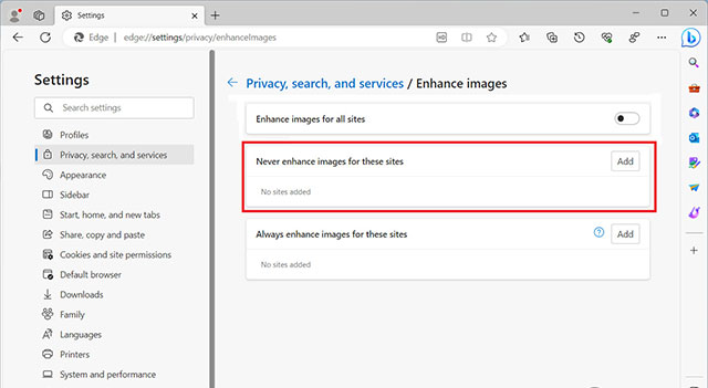 Microsoft đang làm việc để làm cho tính năng này trở nên linh hoạt hơn. Các bản cập nhật sắp tới của Edge sẽ cho phép bạn chọn một cách cân bằng hơn và chỉ định những trang web mà Edge không nên xử lý. Nếu bạn sử dụng Microsoft Edge Canary, hãy đi tới Cài đặt > Quyền riêng tư, Tìm kiếm và Dịch vụ > Nâng cao hình ảnh trong Microsoft Edge và thêm danh sách các trang web ngoại lệ không áp dụng tính năng này.