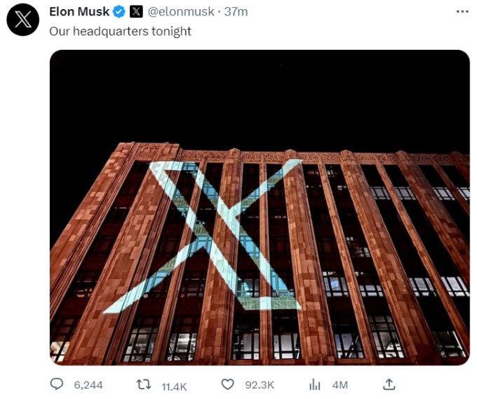 Vào hồi tháng 4, logo chim xanh từng bị đổi thành hình chó Shiba, rất giống với logo Dogecoin (DOGE) và điều này đã giúp tiền số Dogecoin tăng hơn 4 tỷ USD giá trị thị trường. Cùng tháng, Twitter có tân CEO là Linda Yaccarino, được kỳ vọng mang đến làn gió mới cho công ty và biến nền tảng Twitter thành X - ứng dụng của mọi thứ". Trong khi đó, Musk vẫn sẽ đảm nhận nhiều vai trò khác nhau tại Twitter như chủ tịch điều hành & CTO, giám sát sản phẩm, phần mềm & hệ thống.