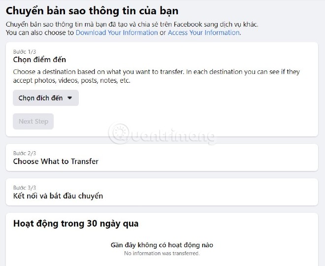 - Trên web: Truy cập Cài đặt & Quyền riêng tư > Cài đặt > Thông tin của bạn trên Facebook > Chuyển bản sao thông tin của bạn > Nhập mật khẩu để xác nhận > Nhấn Chọn đích đến sau đó chọn nền tảng bạn muốn > Nhấn Next Step để chuyển sang bước tiếp theo là chọn lựa những gì bạn muốn chuyển rồi chuyển sang bước Kết nối và bắt đầu chuyển.
