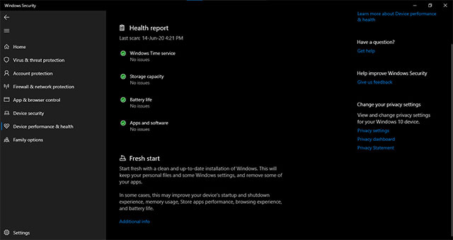 Có thể truy cập tính năng này bằng cách điều hướng đến Settings > Update and Security > Windows Security > Device Performance & Health > Additional Info. Tuy nhiên, trên bản cập nhật May 2020 Update, khi nhấp vào Additional Info, bạn sẽ được đưa tới trang hỗ trợ (Microsoft Support Page) của Microsoft thay vì chạy Fresh Start.