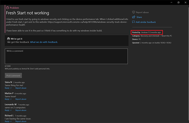 Thậm chí trên trang hỗ trợ chính thức cho May 2020 Update mới được ra mắt, Microsoft cũng không liệt kê vấn đề Fresh Start gặp lỗi, mặc dù người dùng Windows Insiders đã phàn nàn về điều này kể từ tháng 12 năm ngoái.