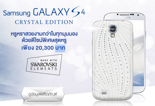 Samsung vừa tung ra 3.500 mẫu S4 bản đặc biệt tại Thái Lan với thiết kế mặt lưng vân da được đính đá Swarovski, tuy nhiên, cấu hình bên trong của máy không thay đổi với việc vẫn dùng chip 8 nhân Exynos Octa.