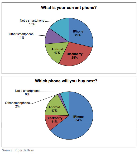 Trong một khảo sát của Piper Jaffray, gần một nửa số người đang sử dụng điện thoại Android và BlackBerry muốn chuyển sang iPhone.