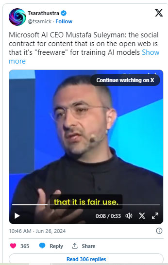 Giám đốc điều hành Microsoft AI Mustafa Suleyman tin rằng thời điểm bạn xuất bản bất kỳ thứ gì trên web mở, nó sẽ trở thành “nội dung miễn phí” mà bất kỳ ai cũng có thể tự do sao chép và sử dụng.