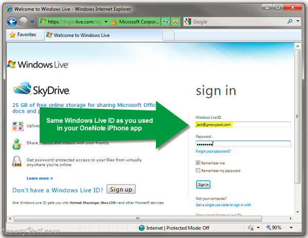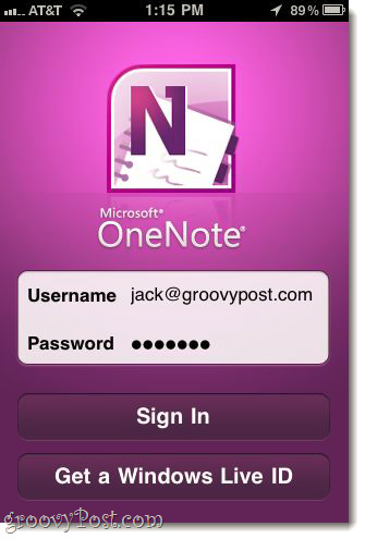 Ở chế độ mặc định, ứng dụng iPhone OneNote sẽ lưu các file chú thích tại mục Personal (Web). Nếu bạn chưa có thư mục này trên web thì ứng dụng sẽ tự tạo ra khi bạn khởi động chương trình lần đầu tiên. Trước tiên, tải phiên bản Microsoft OneNote dành cho iPhone từ App Store (tính đến thời điểm này thì quá trình này vẫn hoàn toàn miễn phí). Sau khi cài đặt, các bạn khởi động OneNote và đăng nhập bằng tài khoản Windows Live ID: