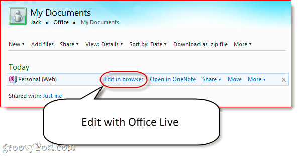 Bên dưới My Documents, các bạn sẽ thấy mục Personal (Web) vừa được sử dụng với ứng dụng iPhone ở bước trên. Để xem được các file note bên trong, chọn tiếp Edit in browser: