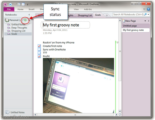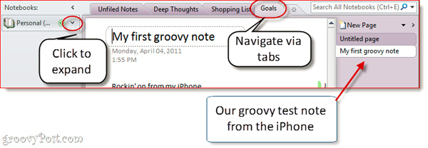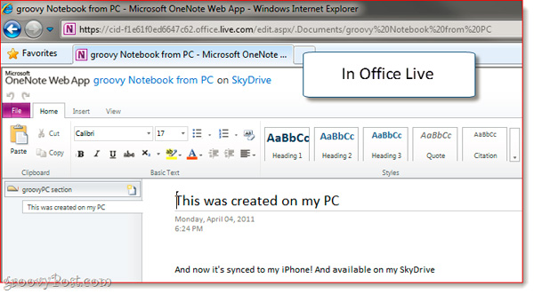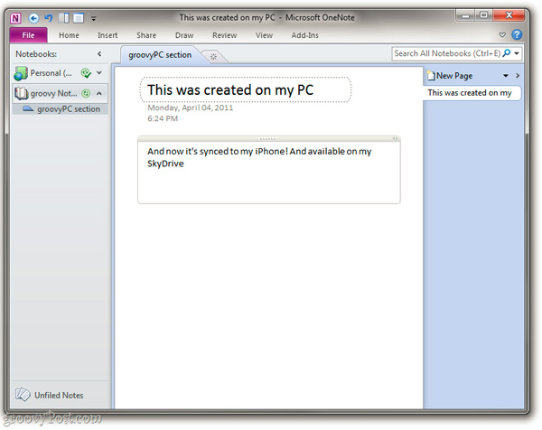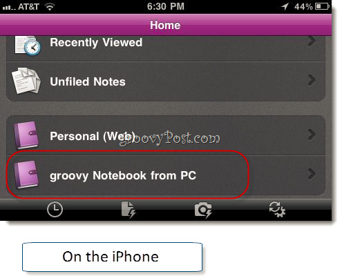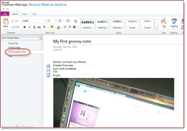 Danh sách notebook và những file note vừa tạo sẽ ngay lập tức xuất hiện trên iPhone và tài khoản SkyDrive: