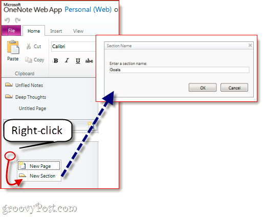 Như đã đề cập đến ở bước trên, chúng ta không thể thêm notebook hoặc sắp xếp lại những file note bên trong ứng dụng OneNote iPhone, nhưng lại có thể làm được bằng Office Live. Trước tiên, các bạn nhấn chuột phải tại phần cửa sổ bên trái và chọn New Section và đặt tên cho section này: