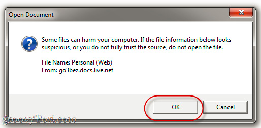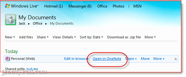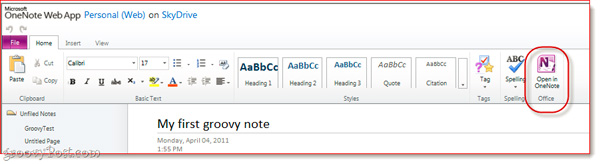 Từ chương trình Microsoft OneNote Web App trong SkyDrive, nhấn nút Open in OneNote: