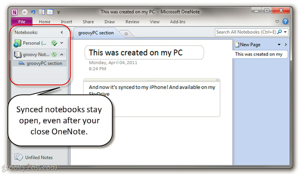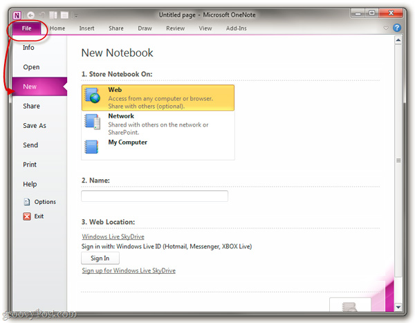 Để tạo mới danh sách notebook và đồng bộ tới tài khoản SkyDrive và iPhone, chọn File trong OneNote và New: