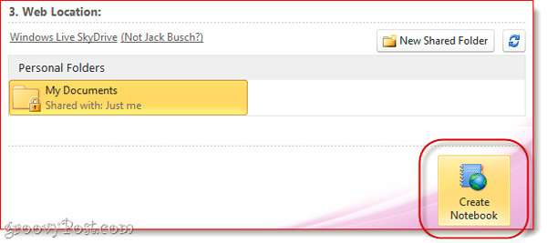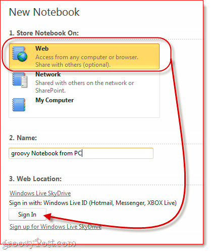 Đặt tên cho phần Notebook này, sau đó nhấn Sign In ở bên dưới Web Location. Khi hệ thống yêu cầu đăng nhập, các bạn hãy điền thông tin của tài khoản Windows Live ID: