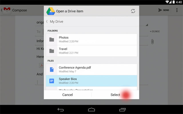 Google hôm qua đã chính thức cập nhật Gmail lên phiên bản 4.9. Trong bản cập nhật này có các tính năng mới như chèn một tập tin từ tài khoản Google Drive của bạn vào email, người nhận có thể xem và tải về trên Google Drive.