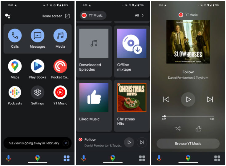 Thao tác này sẽ mở ra một launcher với một mạng lưới các ứng dụng và shortcut gọi/nhắn tin. Điều này bao gồm các ứng dụng của bên thứ nhất như Google Maps, Waze, YouTube Music, Play Sách và Podcasts cũng như Spotify, Pandora, Telegram và các trải nghiệm khác của bên thứ ba trên thiết bị của bạn. Các ứng dụng media cho phép bạn duyệt tìm những bài hát và nội dung khác, đồng thời bạn cũng có giao diện người dùng đang phát toàn màn hình.