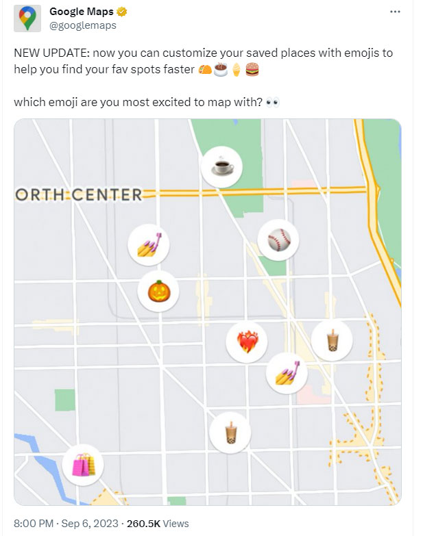 Google Maps mới đây đã tung ra bản cập nhật cho phép người dùng chèn biểu tượng cảm xúc vào các vị trí đã lưu của họ trên bản đồ, qua đó cung cấp một phương thức tìm kiếm, tương tác với những địa điểm yêu thích nhanh chóng, trực quan, mang tính cá nhân hóa cao và tất nhiên là thú vị hơn.