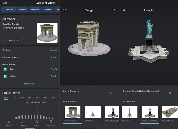 Trong lần cập nhật gần đây, ứng dụng Google Search có thêm tính năng hiển thị các địa điểm nổi tiếng tiếng trên thế giới dưới bản dựng 3D trong tìm kiếm.