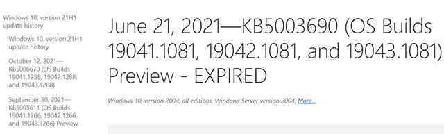 Nếu bạn tạm dừng hoặc bỏ qua các cập nhật khi chúng được gửi đến hệ thống của mình, điều này có thể dẫn đến tình trạng tồn đọng các bản cập nhật và làm tăng kích thước của gói cập nhật. Để Windows Update hoạt động tốt hơn, Microsoft hiện bắt đầu triển khai kế hoạch xóa các bản cập nhật quality update cũ, đã lỗi thời khỏi máy chủ Windows Update. Các bản cập nhật bị xóa này sẽ được gán nhãn dưới dạng “bản cập nhật đã hết hạn”, như trong ảnh chụp màn hình dưới đây.