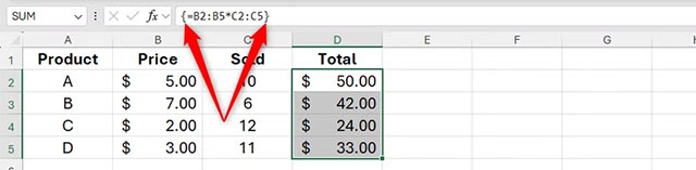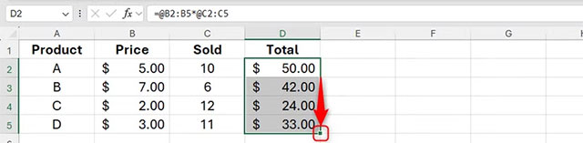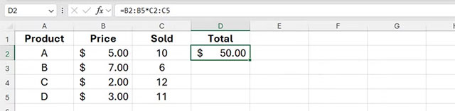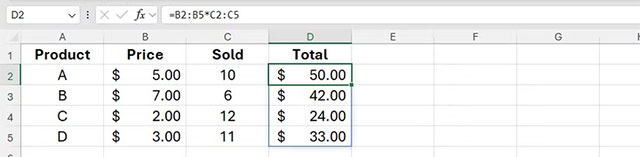 vào ô D2 rồi nhấn Enter, Excel chỉ trả về một kết quả duy nhất, dù công thức tham chiếu đến nhiều ô. Khi đó, bạn cần kéo công thức xuống các ô khác để áp dụng riêng cho từng hàng.