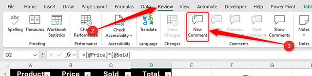 Ngoài ra, trong Excel 365 và Excel Online, bạn còn có thể dùng @ để gắn thẻ (tag) cộng tác viên trong phần bình luận. Chỉ cần chọn ô, vào tab Review → New Comment, rồi gõ @ + tên hoặc email người cần nhắc.