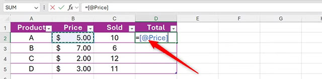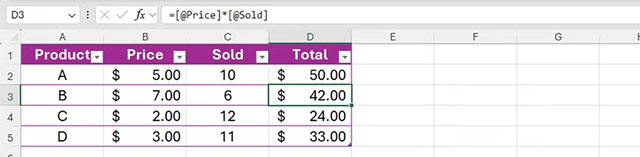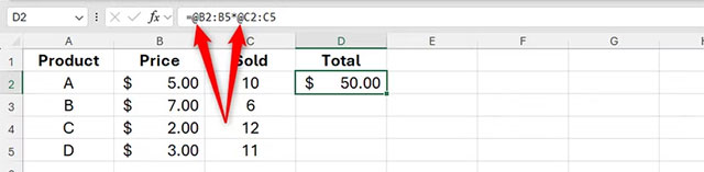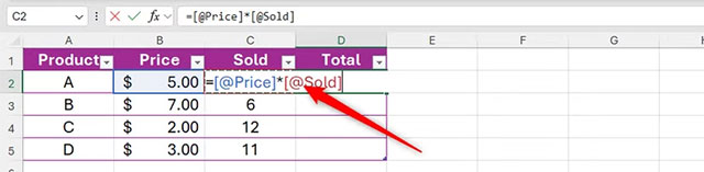 Ví dụ, khi bạn gõ dấu “=” vào ô D2 rồi chọn ô B2 để tạo tham chiếu đầu tiên, Excel sẽ tự động thêm ký hiệu @ trước tên cột. Khi tiếp tục nhân với cột C2, dấu @ lại được chèn thêm một lần nữa.