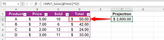 Công thức này sẽ nhân giá trị trong cột Total của từng hàng với 52.
