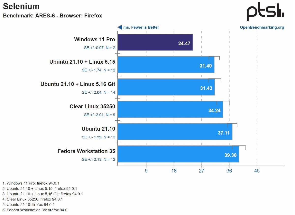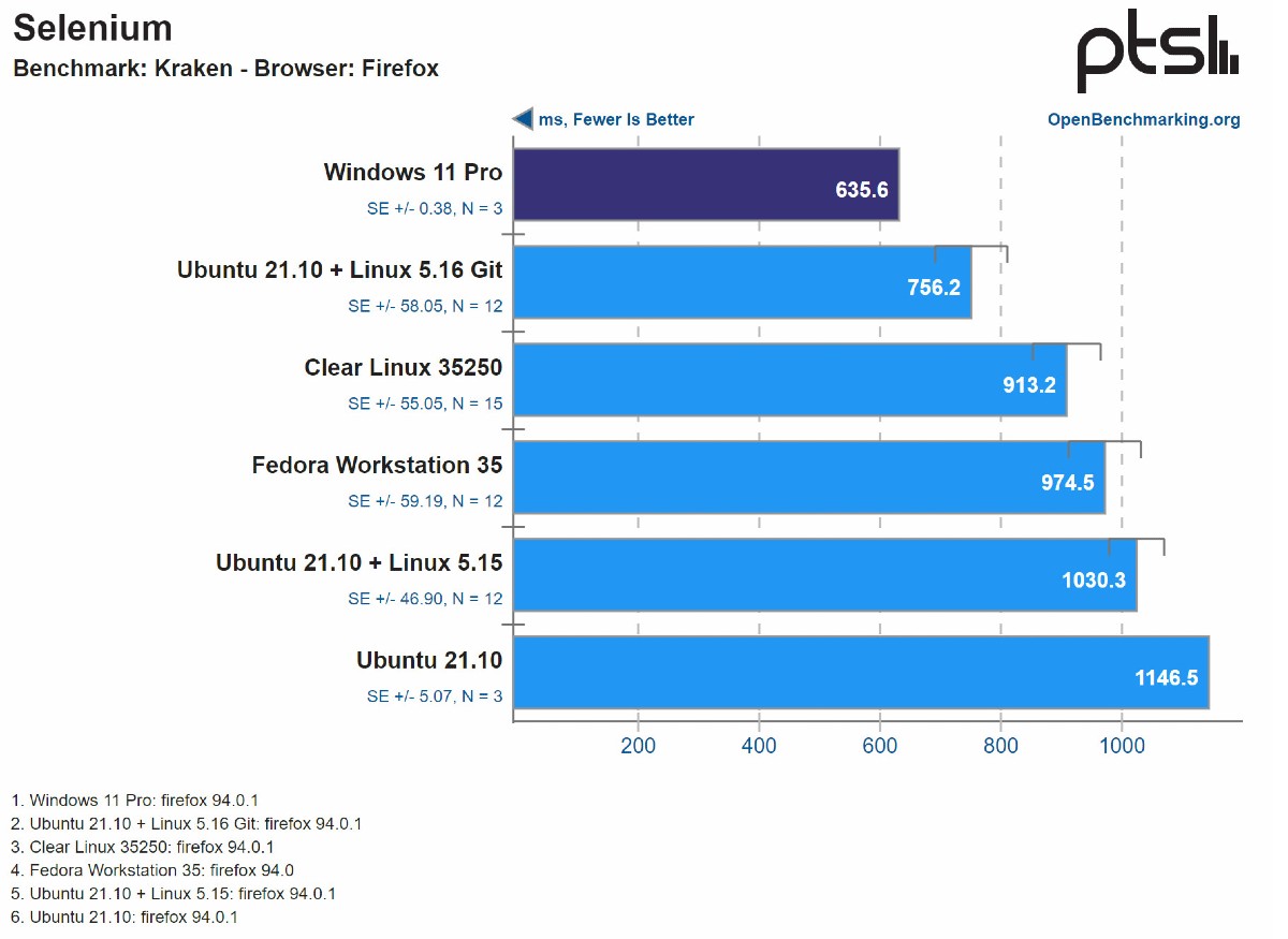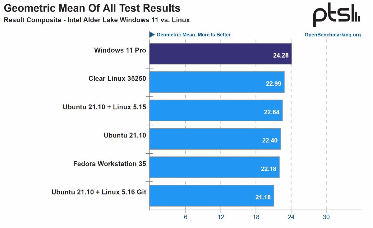 Phoronix cho biết tính tổng trong số 104 bài kiểm tra Windows 11 đứng đầu trong 45,2%. Trước đó, trong lần kiểm tra trước dòng CPU Tiger Lake chạy trên Windows 11 có hiệu suất kém hơn so với trên Ubuntu.