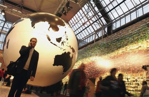 Một người đàn ông đang gọi điện bên lề Hội nghị về khí hậu Copenhagen của Liên Hợp Quốc. Tại đây, các nước đã đạt được một thỏa thuận về cắt giảm khí thải carbon, tuy nhiên, hội nghị vẫn bị chia rẻ sâu sắc bởi các tranh cãi về cắt giảm và chi phí đóng góp. |