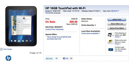 Ít nhất là hai nhà bán lẻ tại Canada trong đó có Best Buy đã bắt đầu thực hiện thông báo này và việc bán hạ giá TouchPad cũng sẽ chỉ diễn ra đến ngày 22/8. Chỉ vài giờ sau khi thông báo giá mới, Best Buy đã thông báo hết hàng cho đặt.