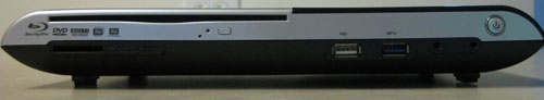 Mặt trước của máy mỏng, với ổ đĩa quang, cổng kết nối USB, khe đọc thẻ nhớ và nút tắt mở nguồn.