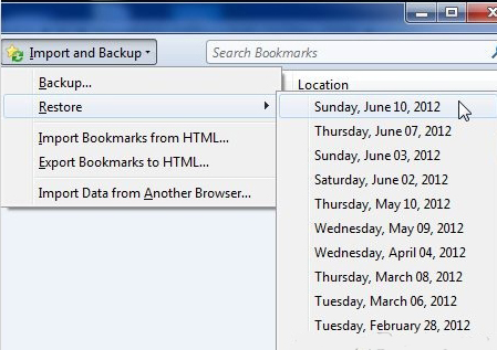 Một tính năng hay của Firefox là cho phép tạo tự động dự phòng cho Bookmarks định kỳ. Nếu đã chót xóa những trang đánh dấu vài ngày trước, bạn vẫn có thể khôi phục chúng. Kích vào Import and Backup và chọn Restore. Các bản lưu dự phòng đã được tạo sẽ hiện ra. Hãy chọn file bookmark mong muốn.