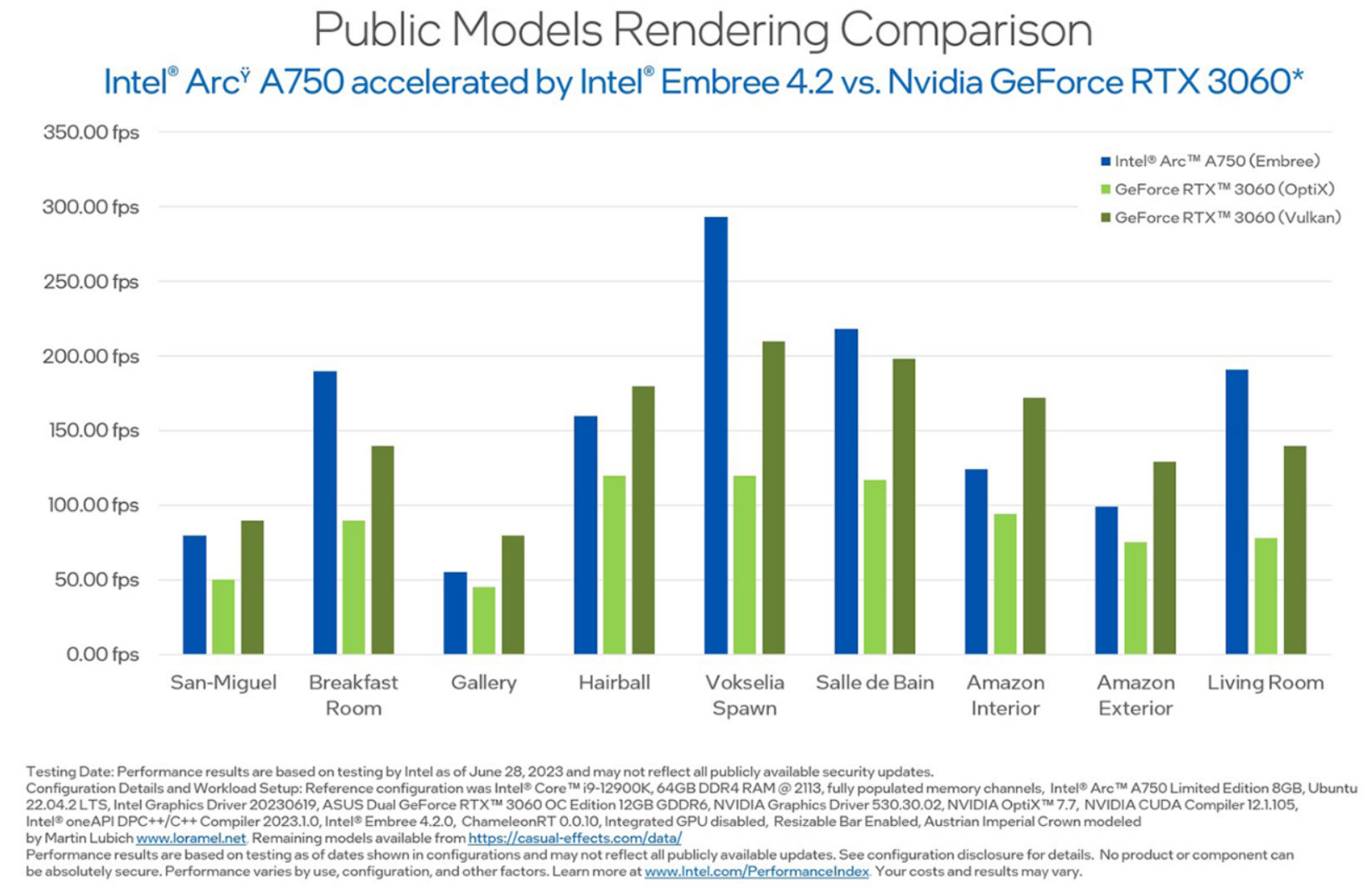 Đánh giá về điều này, Intel cũng đã so sánh Arc A750 với sản phẩm đối thủ NVIDIA GeForce RTX 3060. NVIDIA sử dụng các tính năng NVIDIA OptiX và Vulkan để nâng cao hiệu suất kết xuất, do đó khi so sánh hai công nghệ này, kết quả cho ra khá thú vị. Intel đã đo điểm benchmark cho cả hai GPU bằng công cụ ChameleonRT, và kết quả như sau: