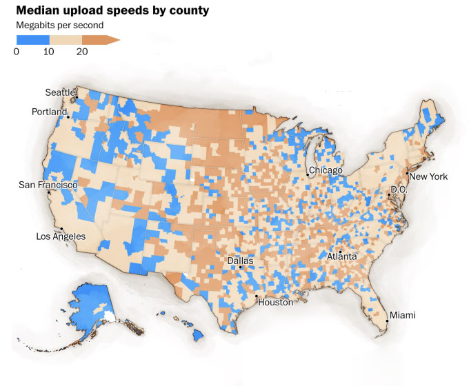 Thậm chí, ở một số khu vực ở Mỹ, tốc độ tải lên trung bình chỉ 1 Mb/giây khiến những công việc như gửi video tới khắp thị trấn cũng có thể chậm hơn chim bồ câu.