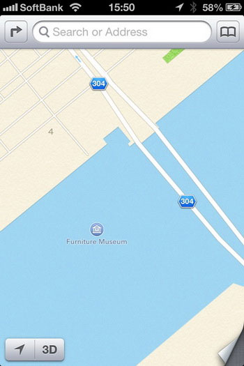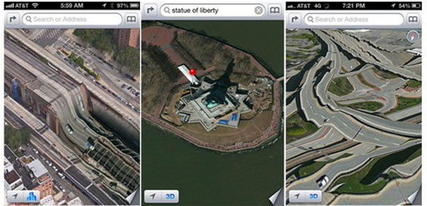 Khi chuyển sang chế độ 3D, các công trình kiến trúc và cầu đường hiển thị trên bản đồ của Apple bị méo mó, biến dạng. Tượng Nữ thần tự do của Mỹ chỉ còn lại cái bóng và cầu Brooklyn bị phá hủy hoàn toàn.