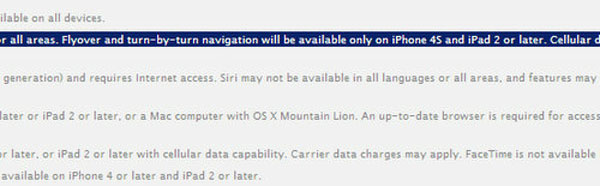 Tuy nhiên, trong một chú thích nhỏ được đưa ra trên trang chủ, Apple cho biết hai tính năng mới trong ứng dụng bản đồ của iOS 6 sẽ chỉ hỗ trợ trên iPhone 4S, iPad 2 và iPad thế hệ mới, cũng như các thiết bị iOS mới hơn. Như vậy, iPhone 4 sẽ không được trang bị những tính năng như trên. Điều này cũng tương tự như với Siri, iPhone 4S thì có còn iPhone 4 thì không.