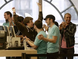 Một khách hàng không giấu nổi sự vui sướng khi mua được mtộ trong những chiếc iPhone 3G đầu tiên. Ảnh: AP. |