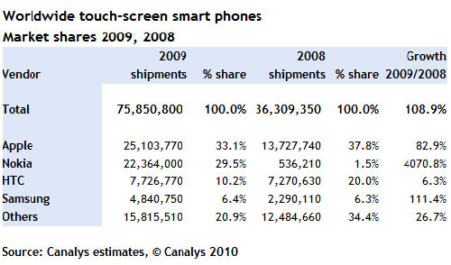 Với hai model là iPhone 3G và iPhone 3GS, Apple chễm chệ ngôi vị đầu bảng với 25 triệu máy được bán và chiếm tới 33,1% thị phần toàn cầu. Dù mới tham gia sản xuất smartphone cảm ứng từ cuối 2008, nhưng Nokia cũng đã bán được tới 22 triệu model năm qua và đứng thứ hai với 29,5% thị phần.