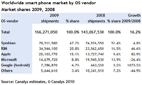 Dù không có nhiều đột phá, nhưng Symbian tiếp tục là hệ điều hành số một trên thị trường smartphone với lượng thiết bị bán ra gấp hai lần nền tảng đứng sau là BlackBerry của RIM. Apple đứng thứ ba, hãng này đã có doanh số tăng tới 82,9% so với năm 2008.