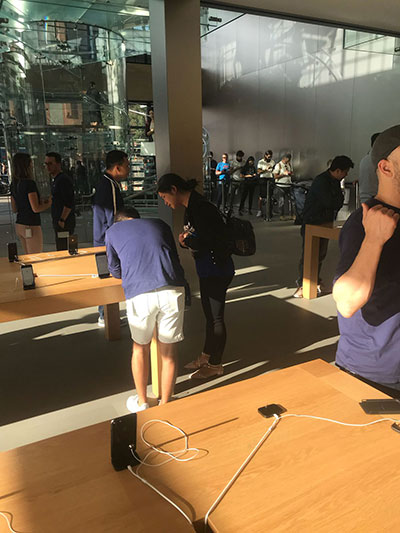 Bên ngoài cửa hàng, một công nhân ngạc nhiên bởi ít người quá. Anh này nói rằng bạn có thể đăng kí mua một chiếc iPhone 8 và đi ra khỏi cửa hàng chỉ trong 15 phút.